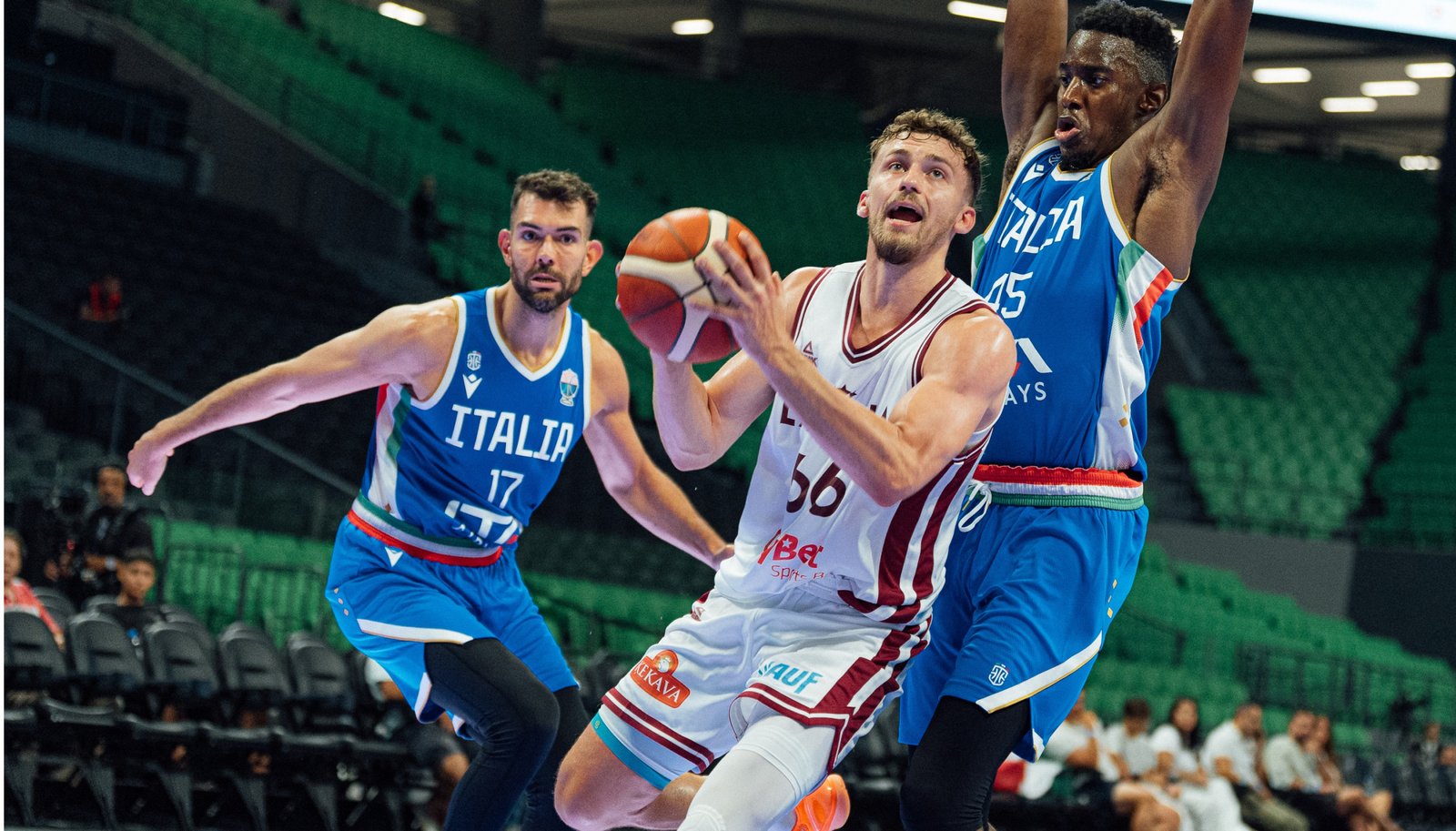 A 14:2 run at the start, a slump of 3:17 midway through the first half (27:27), and a 12:2 surge (41:31) before halftime – the wide player rotation and occasional excessive risks in offense reminded that this was still just a warm-up match. For the third game in a row, Latvia made more three-pointers than two-pointers, and with impressive accuracy (9/19 at halftime). The Italian team, in contrast, went 0/11.